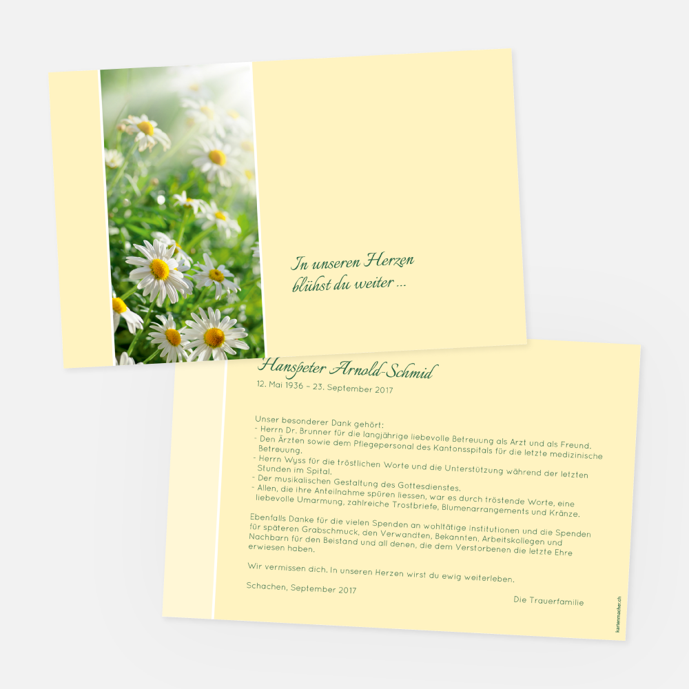 Trauerkarte selbst online gestalten. 2-seitige Karte mit Foto von Margeriten, Farbflächen, chamois