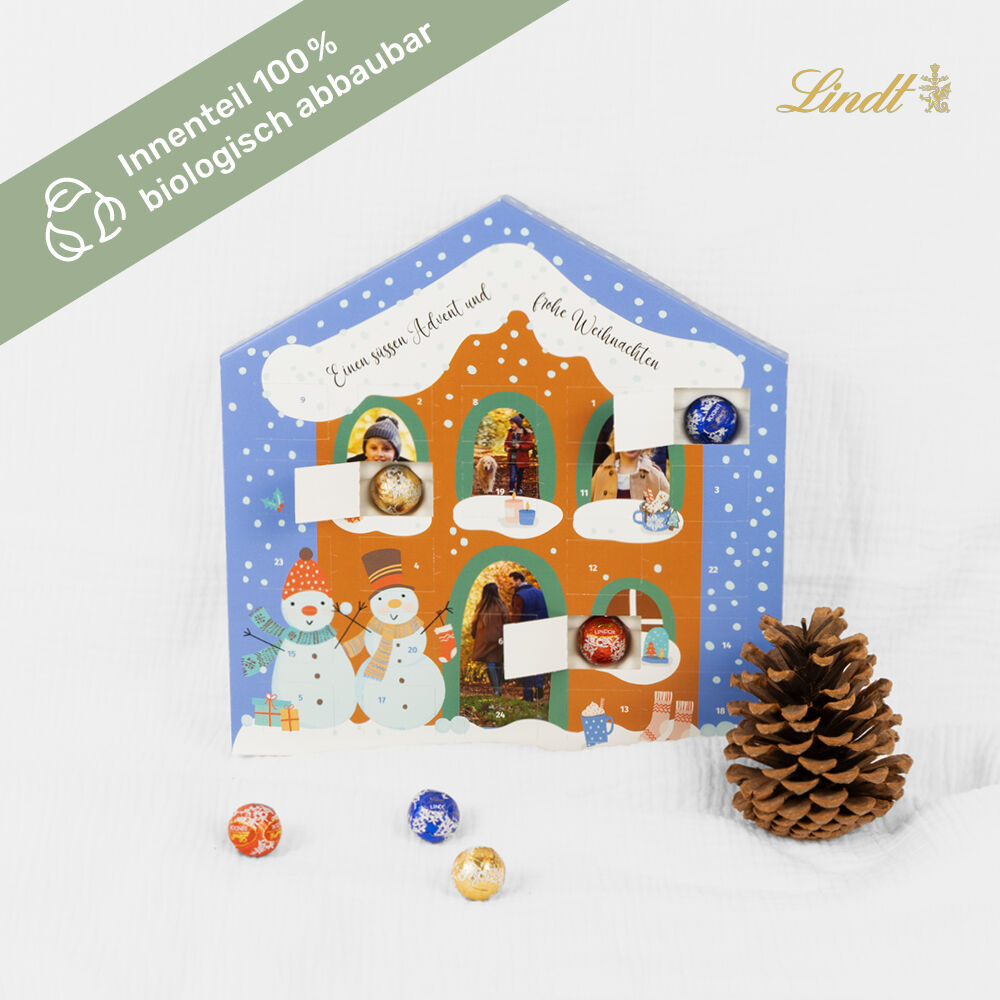 In den Adventskalender können Fotos und/oder personalisierter Text eingefügt werden, die dem Kalender seine Einzigartigkeit verleihen – ideal als Vorweihnachtsgeschenk. Enthalten sind 24 feine Lindt Lindor Minis in vier verschiedenen Sorten. Die Hülle ist rundum bedruckbar, das Inlay besteht zu 100 % aus recyceltem Material.