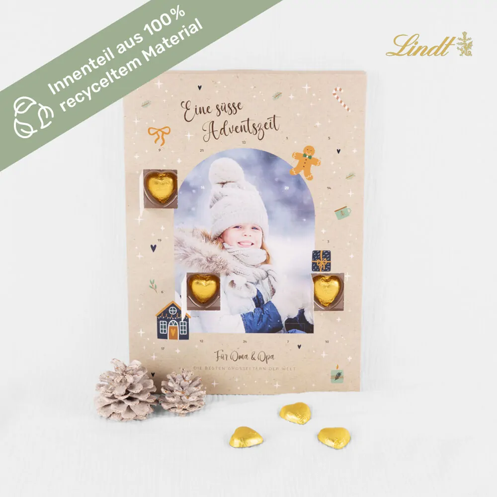 24 feine Lindt-Schokoladen versüssen die Vorweihnachtszeit deiner Liebsten. Schenke einen individualisierten Adventskalender mit 23 Lindt-Schokoladenherzen und hinter dem 24. Türchen versteckt sich ein zartschmelzendes Pralinenherz von Lindt Lindor. Das Inlay ist aus 100% recycletem Material hergestellt.