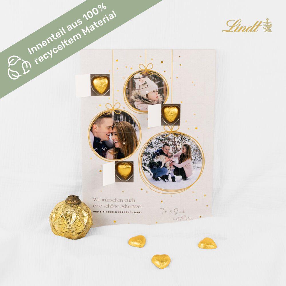 24 feine Lindt-Schokoladen versüssen die Vorweihnachtszeit deiner Liebsten. Schenke einen individualisierten Adventskalender mit 23 Lindt-Schokoladenherzen und hinter dem 24. Türchen versteckt sich ein zartschmelzendes Pralinenherz von Lindt Lindor. Das Inlay ist aus 100% recycletem Material hergestellt.
