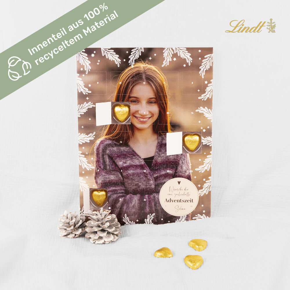 24 feine Lindt-Schokoladen versüssen die Vorweihnachtszeit deiner Liebsten. Schenke einen individualisierten Adventskalender mit 23 Lindt-Schokoladenherzen und hinter dem 24. Türchen versteckt sich ein zartschmelzendes Pralinenherz von Lindt Lindor. Das Inlay ist aus 100% recycletem Material hergestellt.