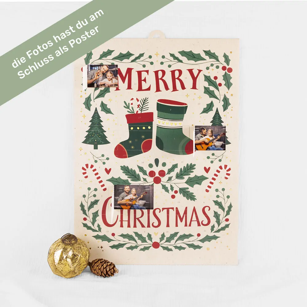 Ein Foto-Adventskalender passend zur Weihnachtszeit zum selbst Gestalten und mit einer bleibenden Erinnerung. Hinter jedem der 24 Türchen kannst du deine persönlichen Fotos platzieren. Der Inhalt des Adventskalender kannst du anschliessend als A3-Bild aufhängen. Der Adventskalender hat eine Vorrichtung zum Aufhängen. 100% klimaneutral produziert.