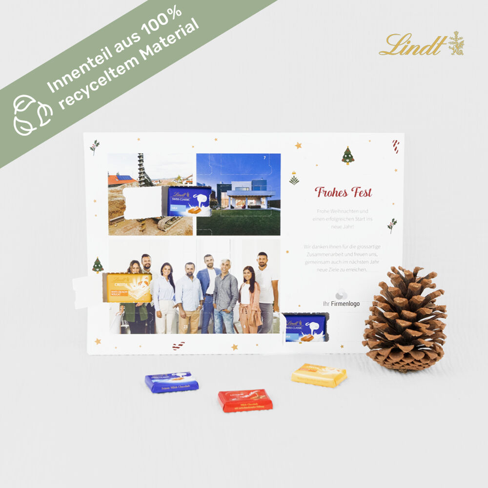 Liebevolle Tischkalender mit 24 exklusiven Lindt Napolitains assortiert, welche einen einzigartigen Geschmack versprechen. Gestalte die Frontseite mit persönlichen Fotos oder Texten. Das Inlay ist aus 100% recyceltem Material hergestellt.