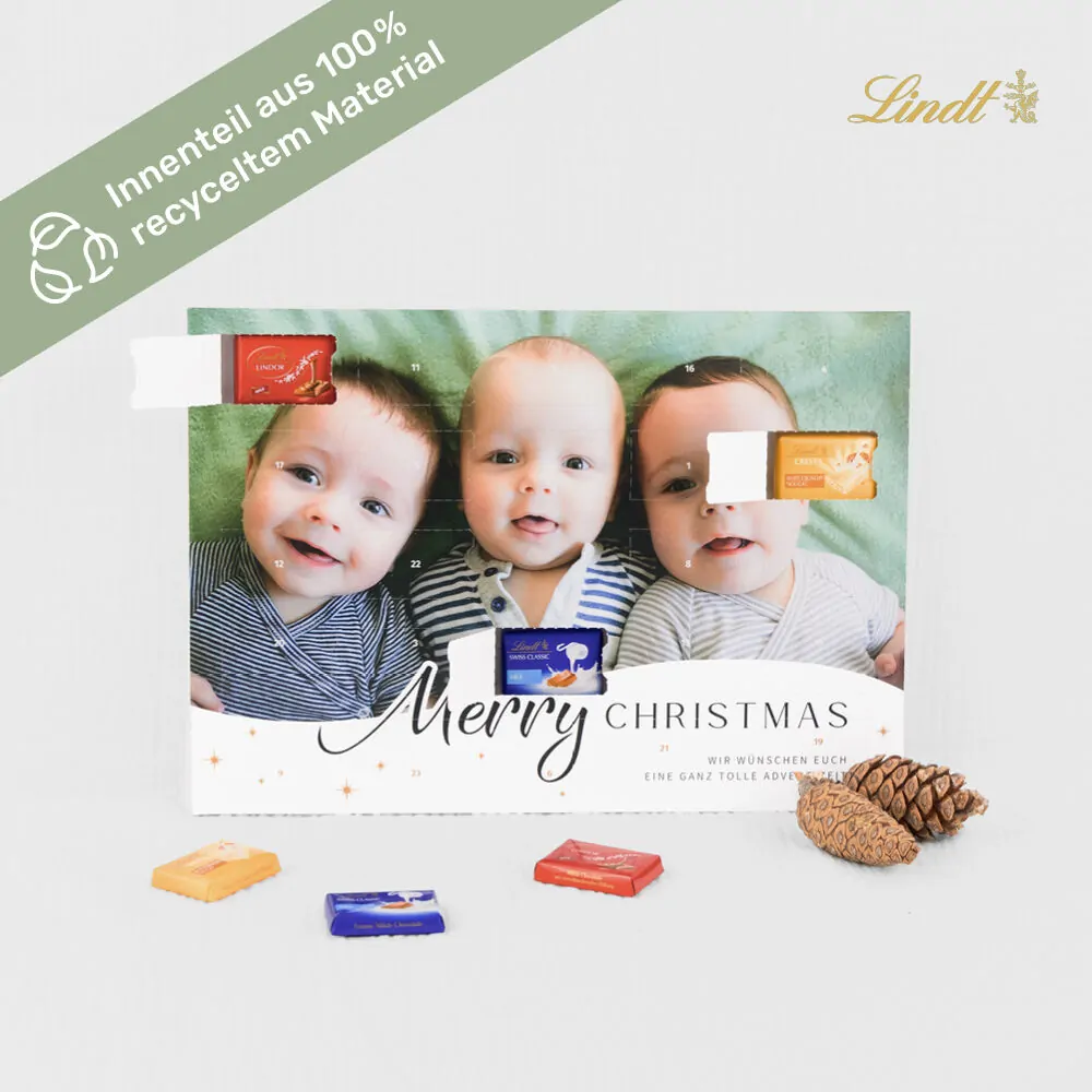 Liebevolle Tischkalender mit 24 exklusiven Lindt Napolitains assortiert, welche einen einzigartigen Geschmack versprechen. Gestalte die Frontseite mit persönlichen Fotos oder Texten. Das Inlay ist aus 100% recyceltem Material hergestellt.