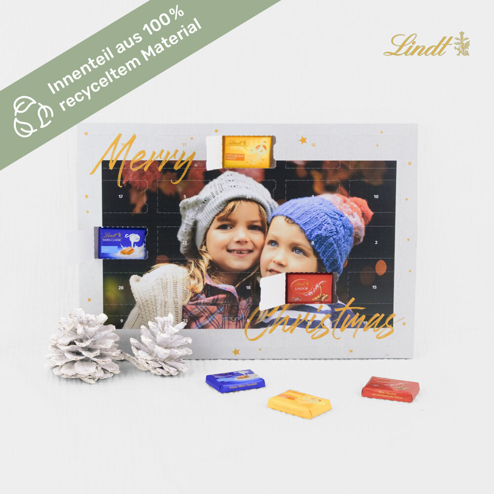 Liebevolle Tischkalender mit 24 exklusiven Lindt Napolitains assortiert, welche einen einzigartigen Geschmack versprechen. Gestalte die Frontseite mit persönlichen Fotos oder Texten. Das Inlay ist aus 100% recyceltem Material hergestellt.