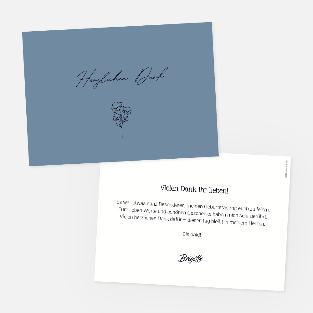 Dankeskarte Geburtstag selbst online erstellen. 2-seitige Karte ohne Fotos. Schlichtes Design mit Blume, marienblau