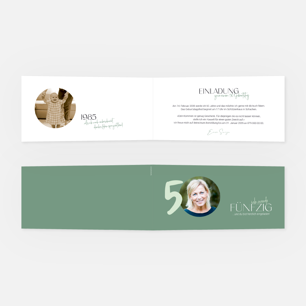 Einladung zum Geburtstag selbst online erstellen. 4-seitige Karte mit Platz für Fotos. Grosse Zahl, Typografie, linde