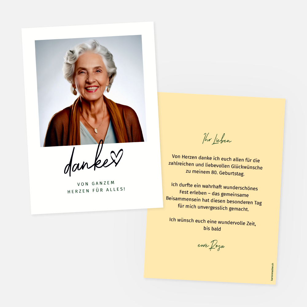 Dankeskarte zum Geburtstag selbst online erstellen. 2-seitige Karte mit einem Foto. Schlichtes, modernes Design, Herzchen, lichtgelb