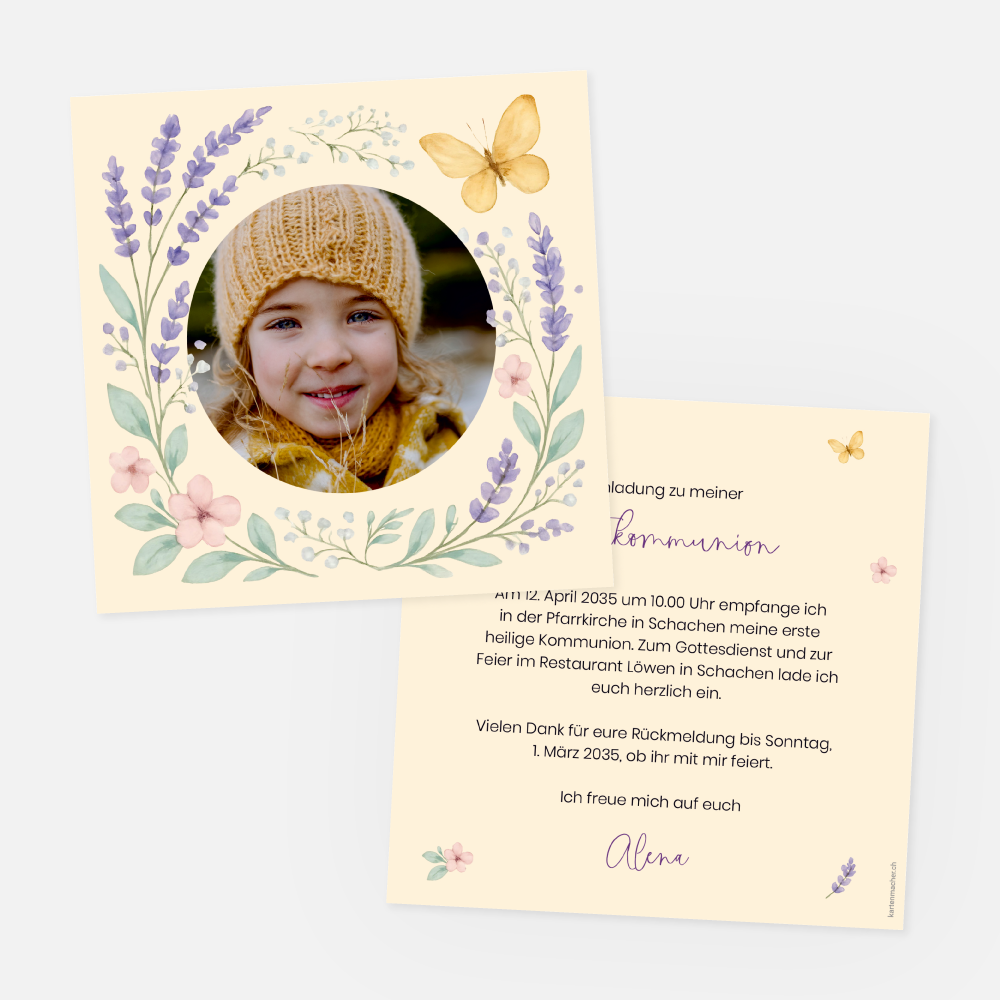 Einladungskarte Erstkommunion selbst online erstellen. Karte mit rundem Foto, floral, Kranz, Blumen, Schmetterlinge, chamois