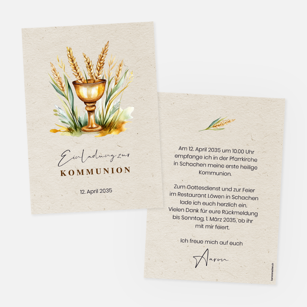 Einladungskarte Erstkommunion selbst online erstellen. 2-seitige Karte ohne Fotos. Schlicht, Weizenhalm, Kelch-Illustration, braun
