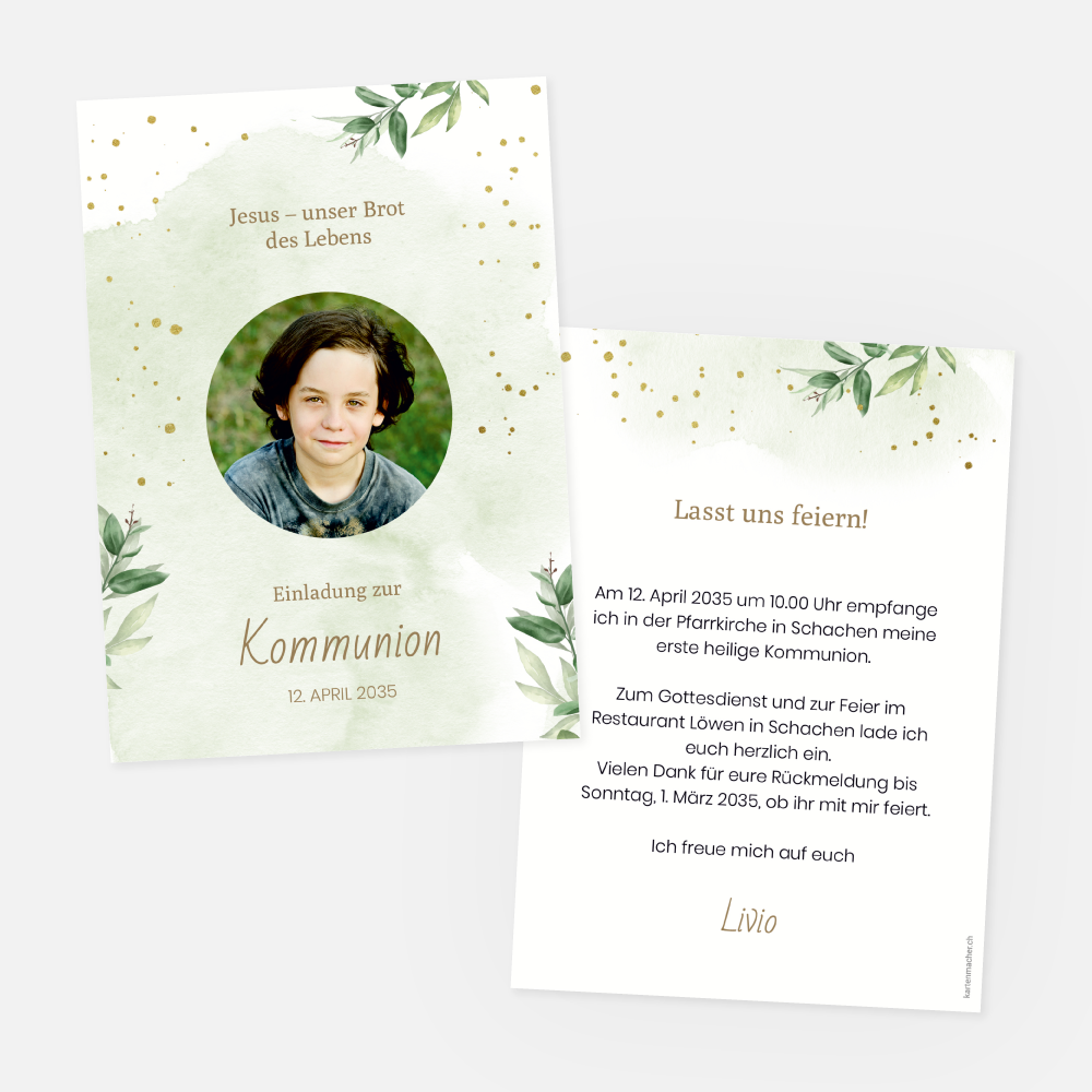 Einladungskarte Erstkommunion selbst online erstellen. 2-seitige Karte mit einem Foto. Verspielt, Zweige, goldene Punkte, Farbtupfer, linde