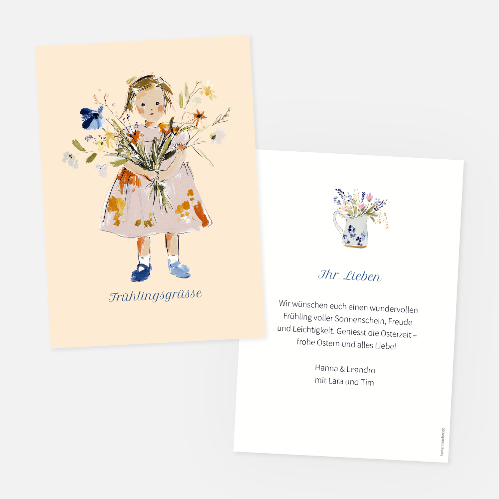 Ostergrüsse selbst online erstellen. 2-seitige Karte mit Illustrationen. Mädchen, Blumenstrauss, apricot