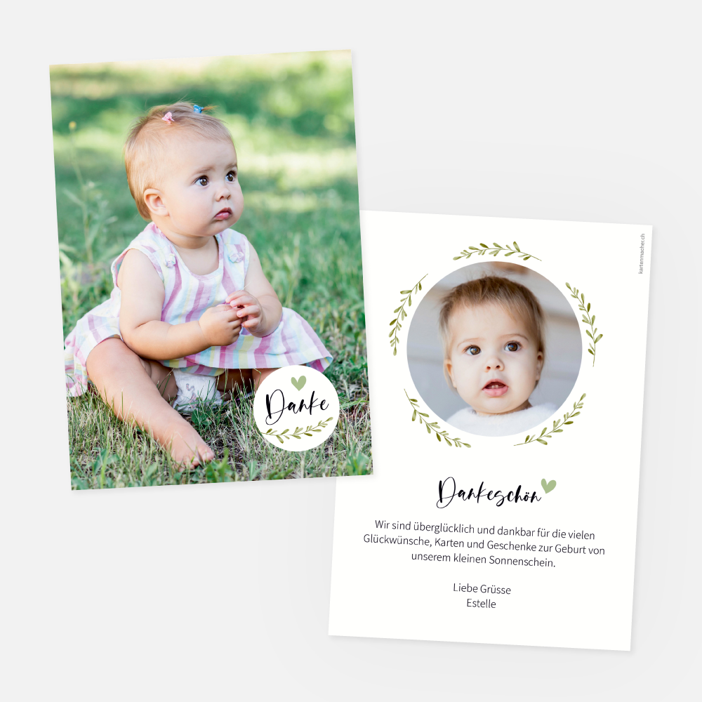 Danekskarte Geburt selbst online gestalten. 2-seitige Karte, hoch. Mit einem grossen und einem runden Foto, schlichtes Design, mit kleinem Herzchen, Pflanzen, linde