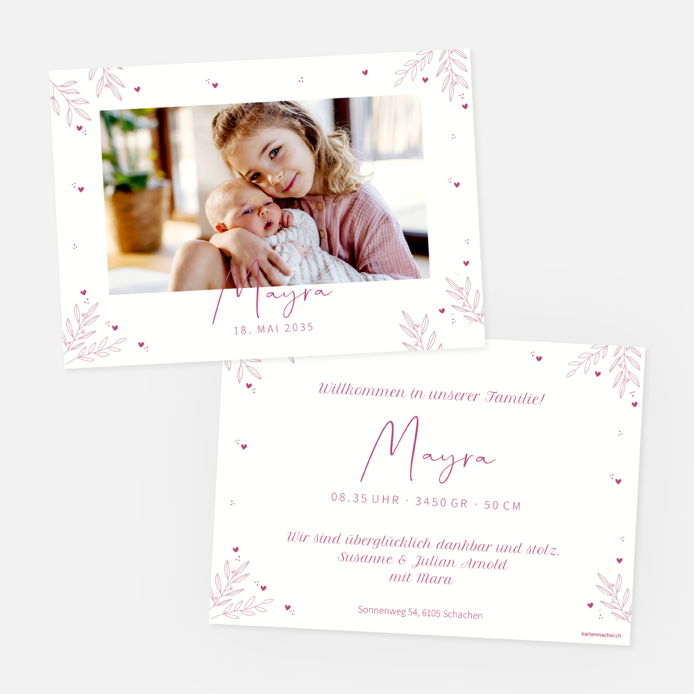 Dankeskarte Geburt selbst online gestalten. 2-seitige Karte mit einem grossen Foto, floral, mit Herzchen, purpurrot