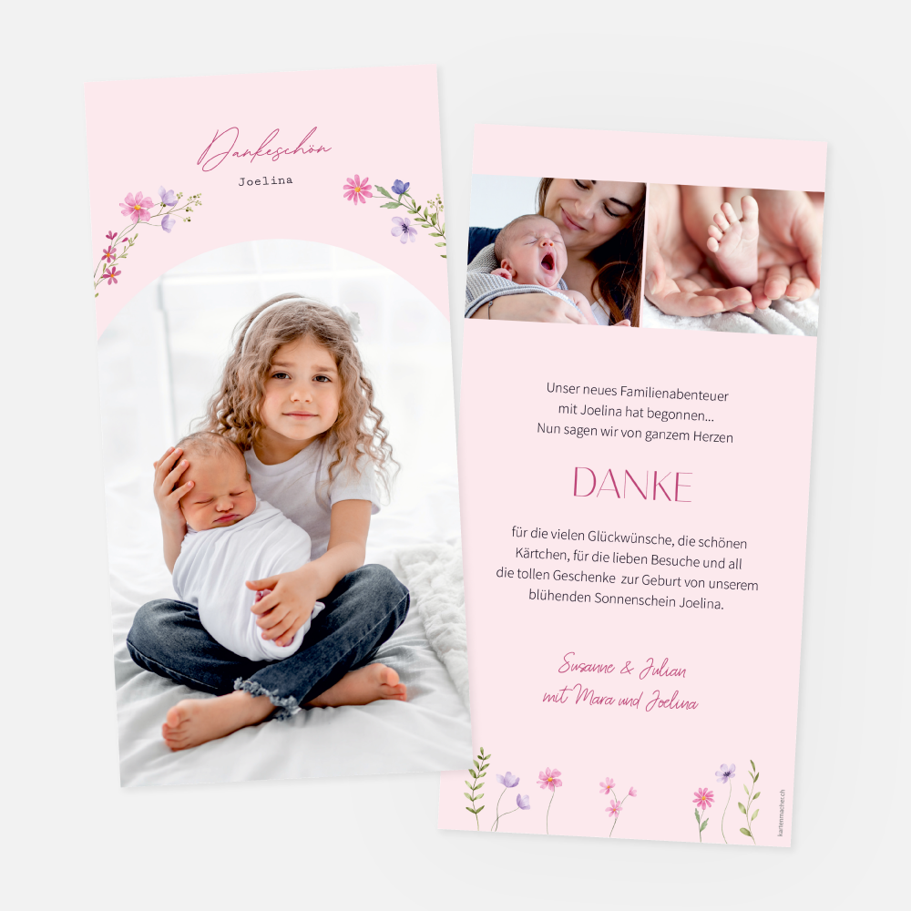Dankeskarte Geburt selbst online gestalten. 2-seitige Karte mit Fotos. Schlicht, floral, mit verschiedenen Blumen, kirschblüte