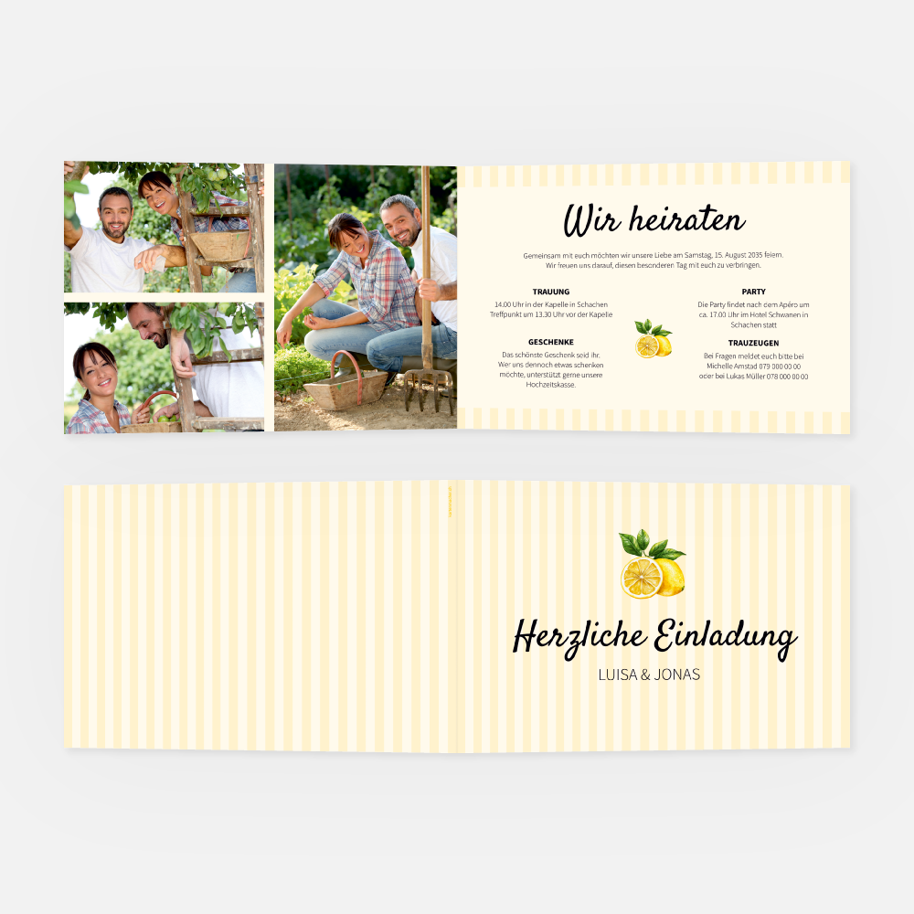 Einladungskarte Hochzeit selbst online gestalten. 4-seitige Falzkarte quer mit 3 Fotos. Sommerliches Design, mit Zitronen, gestreift, sonnengelb