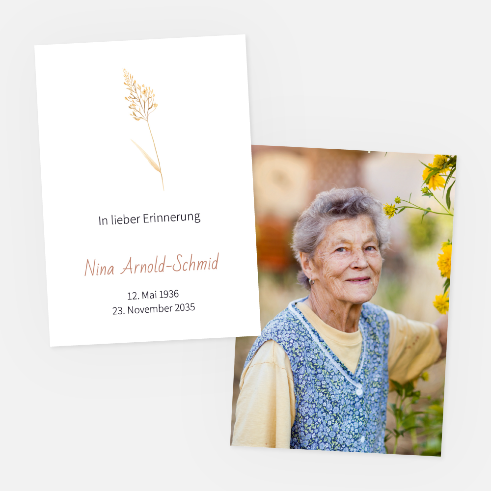 Leidbild oder Totenbildchen einfach online erstellen. Schlichtes Design, ganzseitiges Foto, Symbol auf der Rückseite.